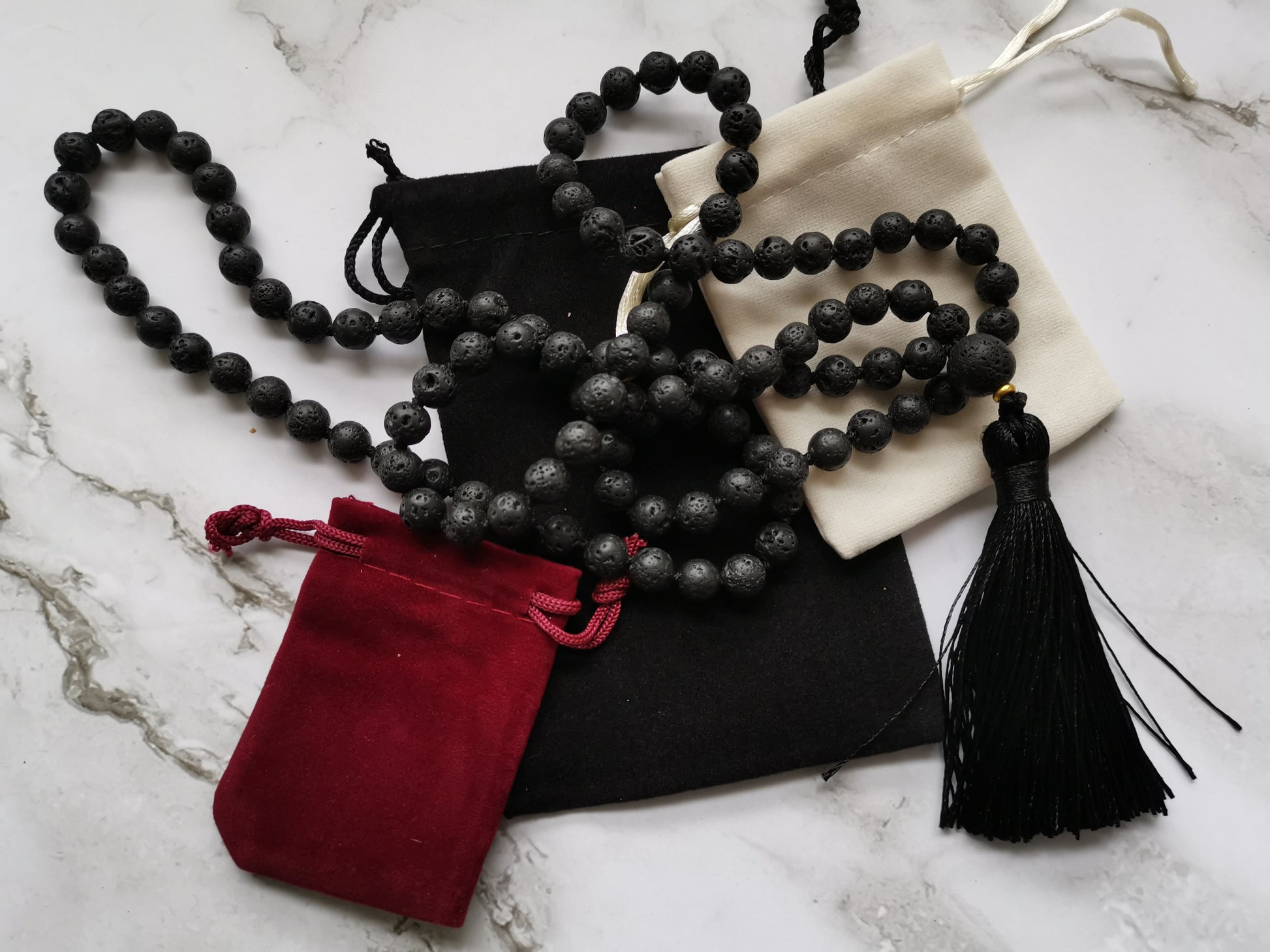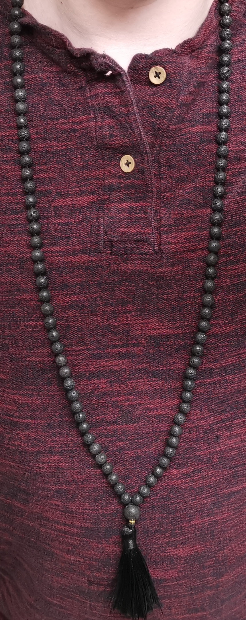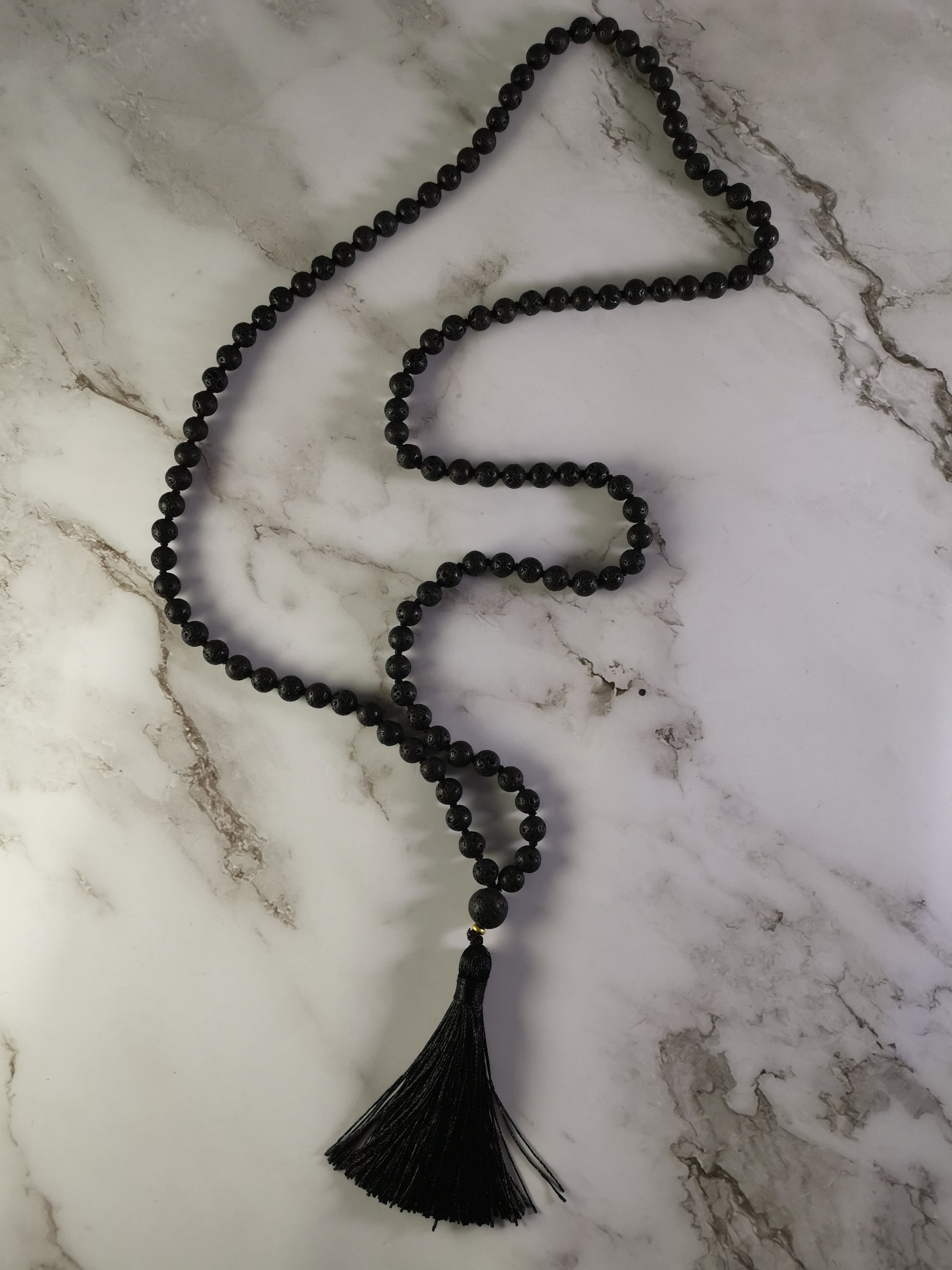 Vankkarakenteinen ja jykevä kivestä valmistettu musta itämainen mala 108 helmellä. Voidaan käyttää meditaation, mantrojen ja rukouksien tukena tai kaulakoruna. Rukoushelmien mukana tulee samettinen korujen säilytyspussi.
