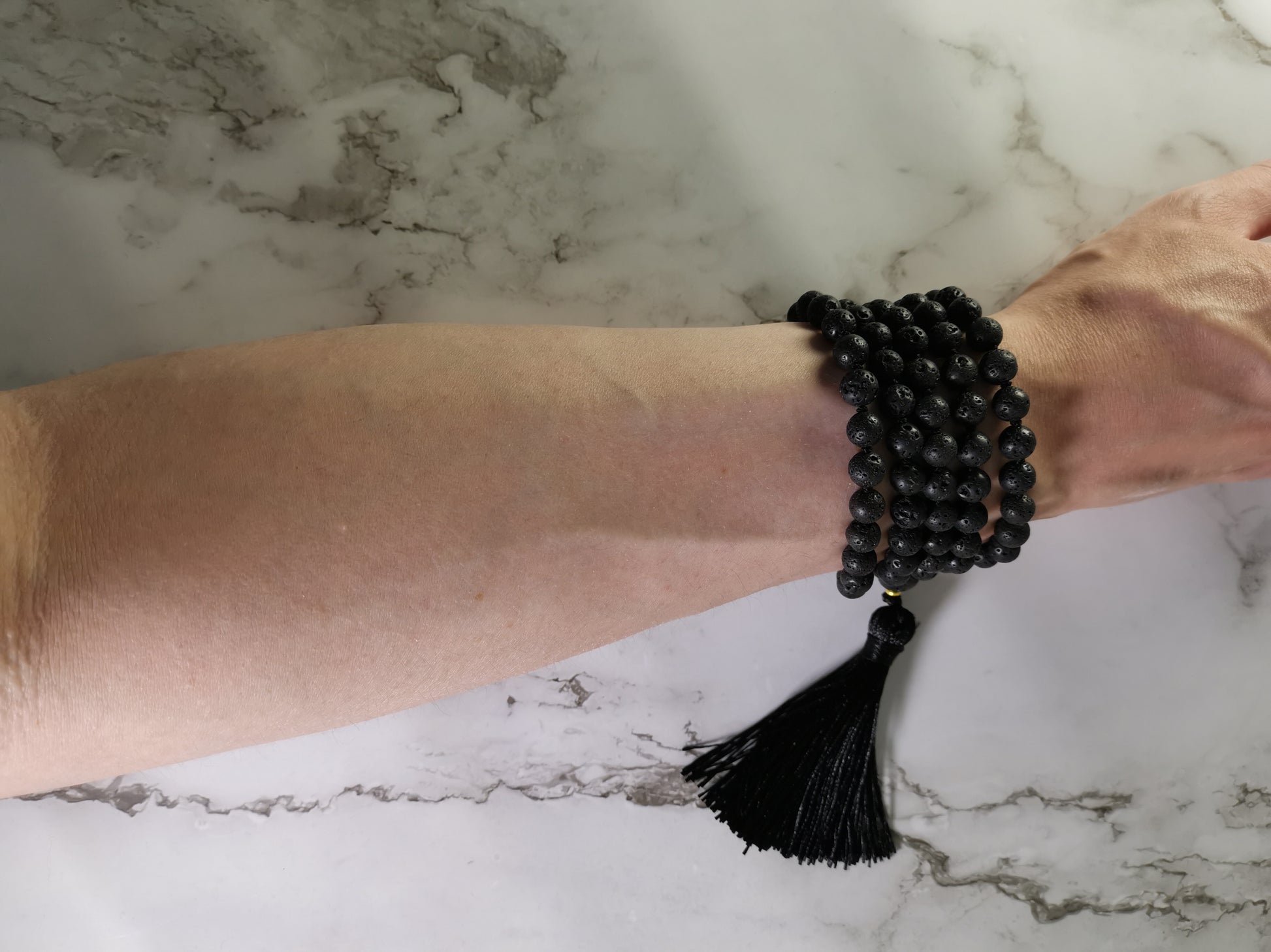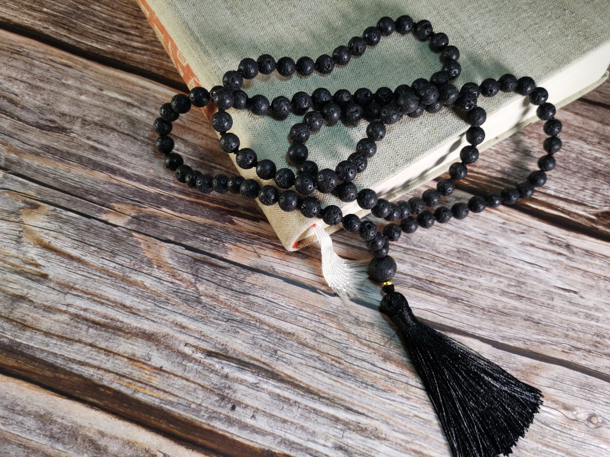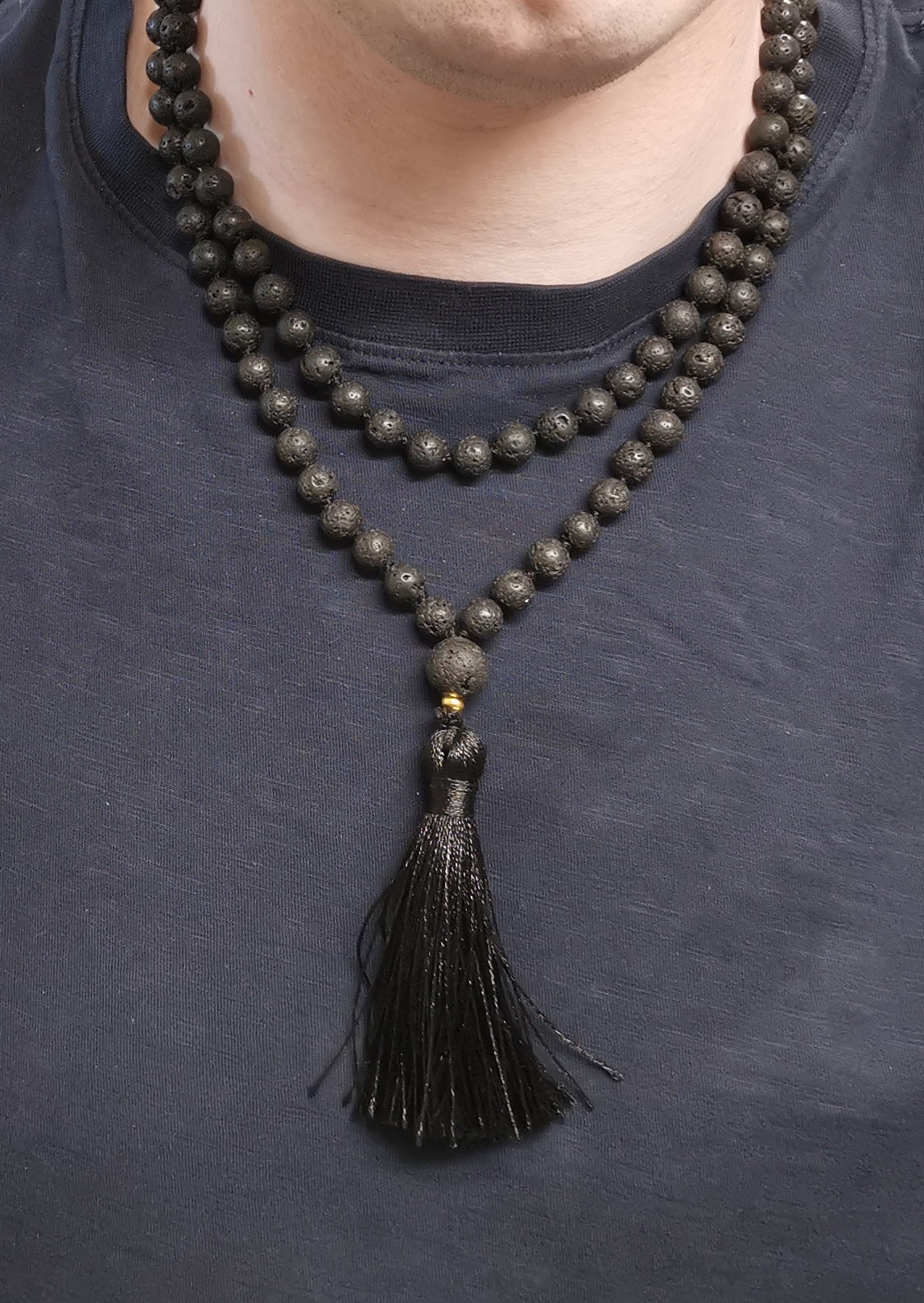 Vankkarakenteinen ja jykevä kivestä valmistettu musta itämainen mala 108 helmellä. Voidaan käyttää meditaation, mantrojen ja rukouksien tukena tai kaulakoruna. Rukoushelmien mukana tulee samettinen korujen säilytyspussi.