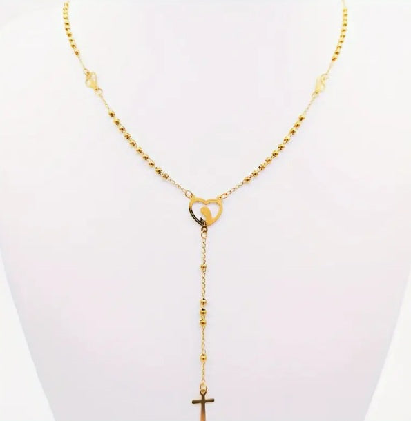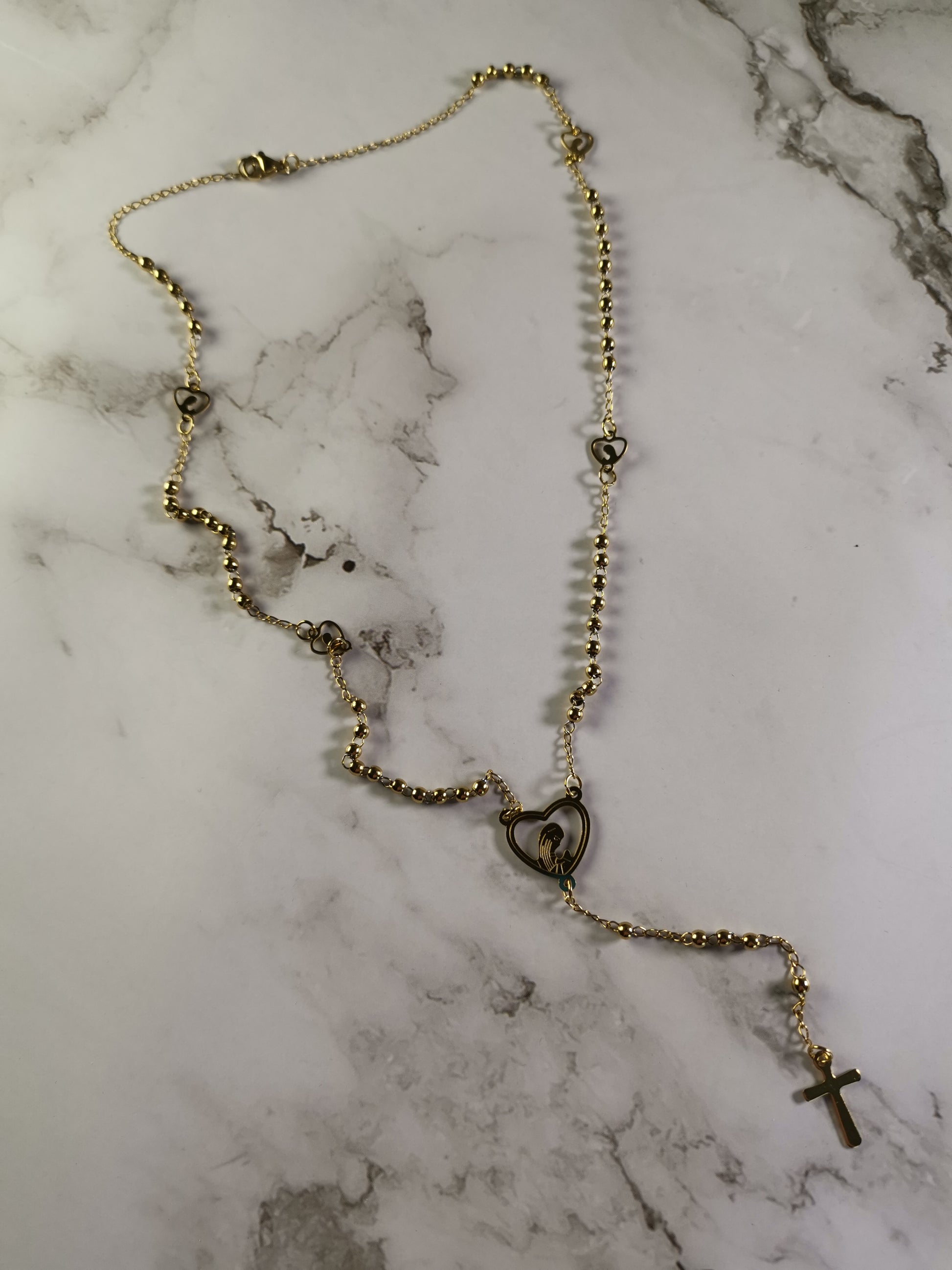 Hento ja hengellinen kultainen kaulakoru naisille, jossa on sydän ja risti. Tehty ruostumattomasta teräksestä. Mukana samettinen korujen säilytyspussi.