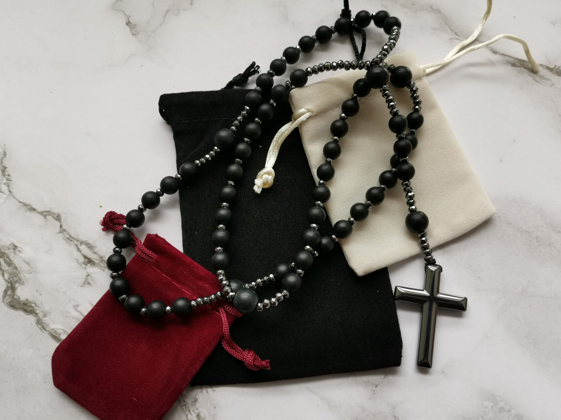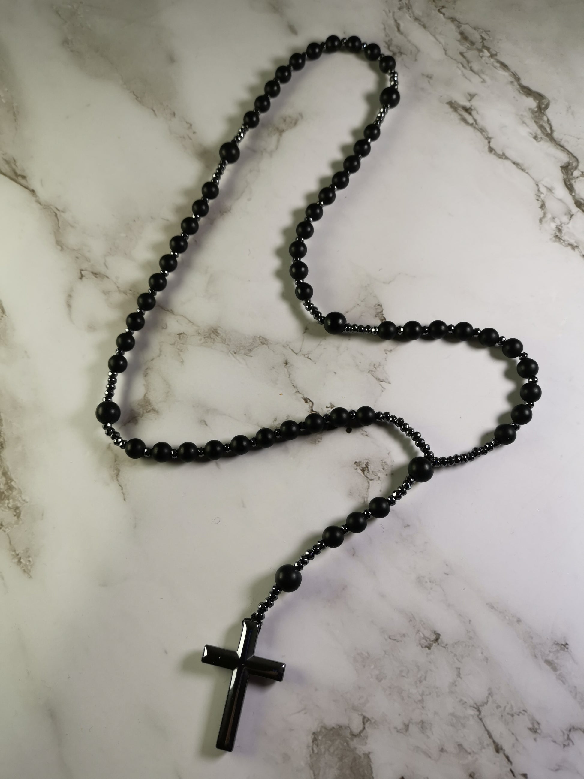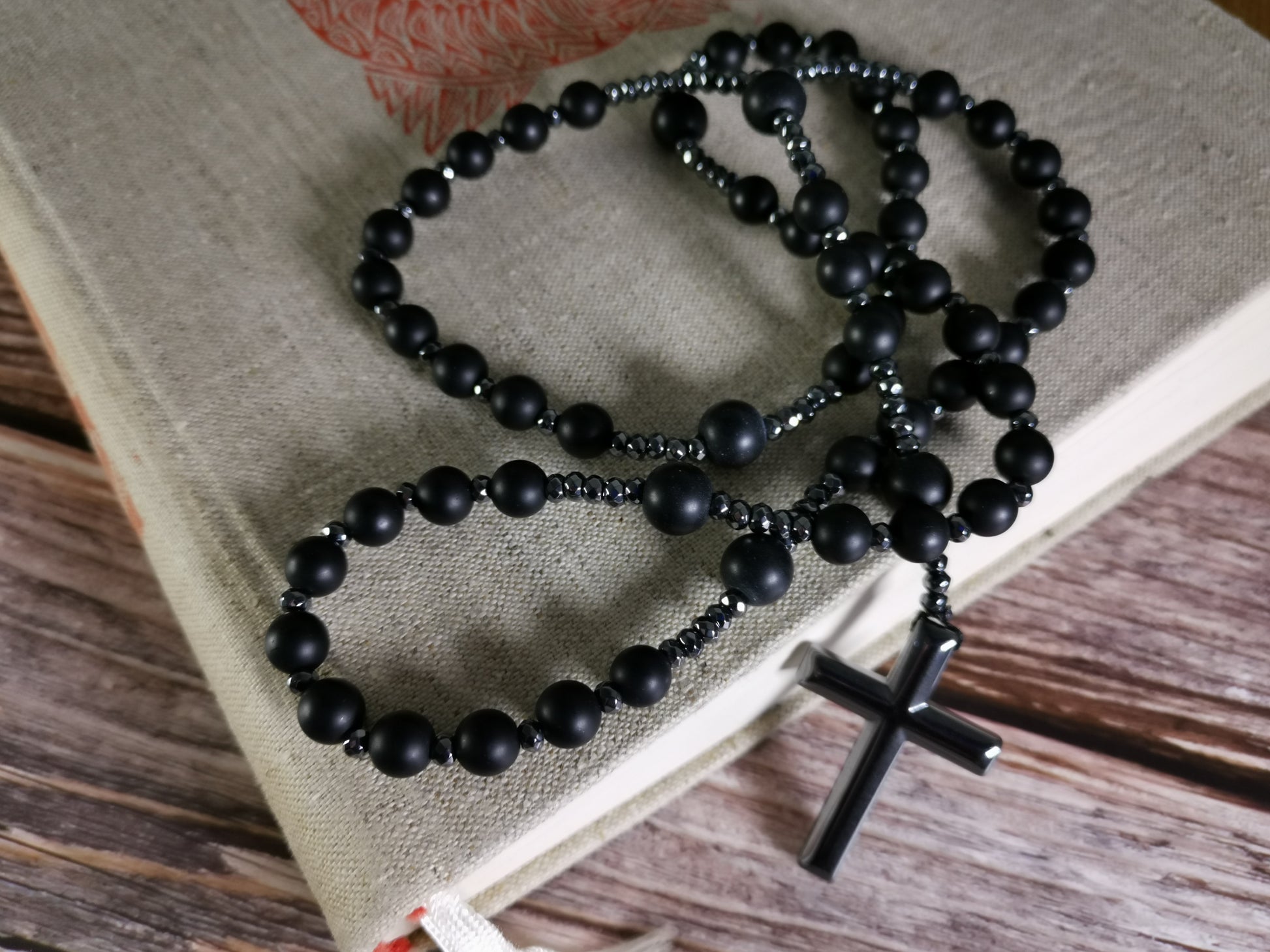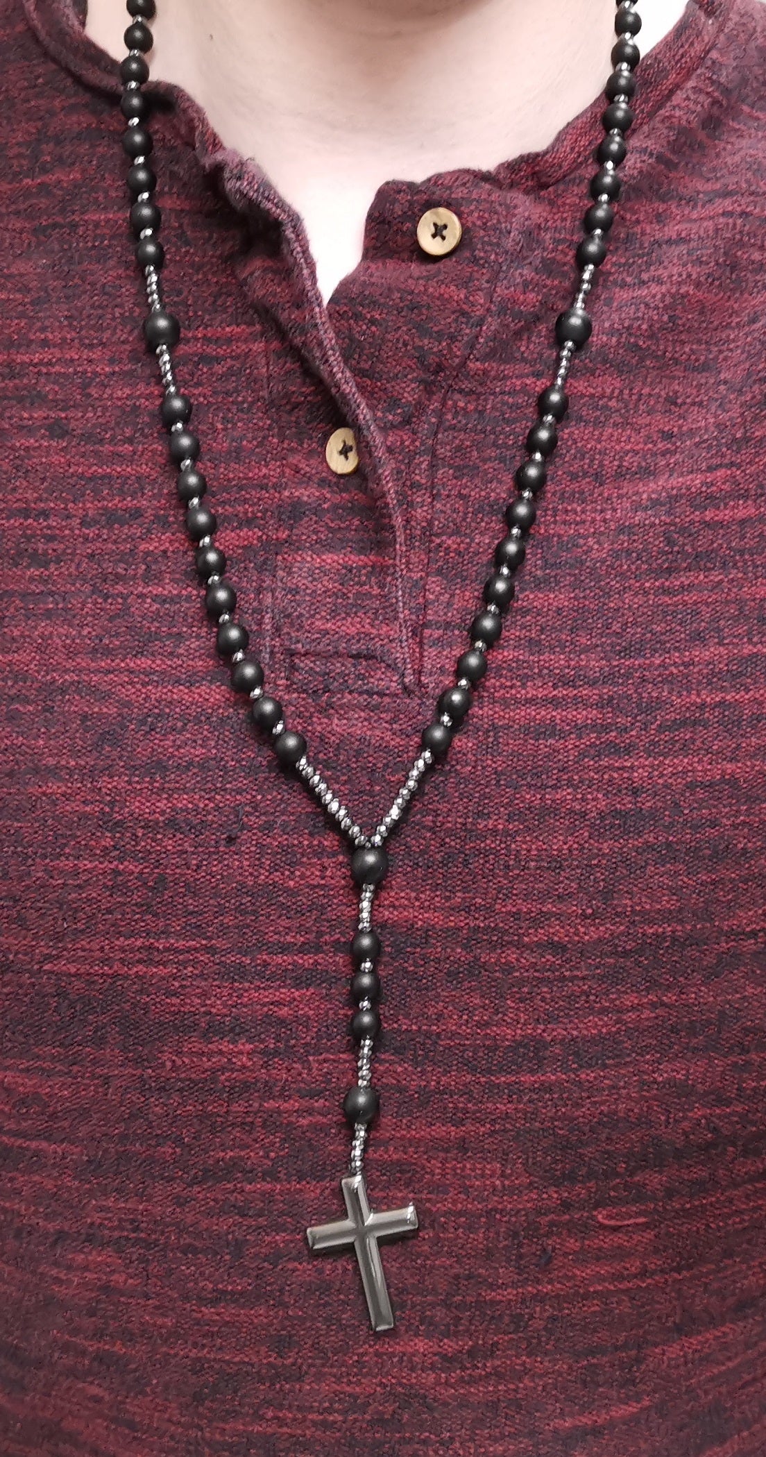Hopean värisellä metalliketjulla varustettu voimakas musthelminen ruusukko koruttomalla metallisella krusifiksillä. Kristillinen rukousnauha, jota voi käyttää esim. rukouksien laskemiseen tai kaulakoruna. Rukoushelmien mukana tulee samettinen korujen säilytyspussi.