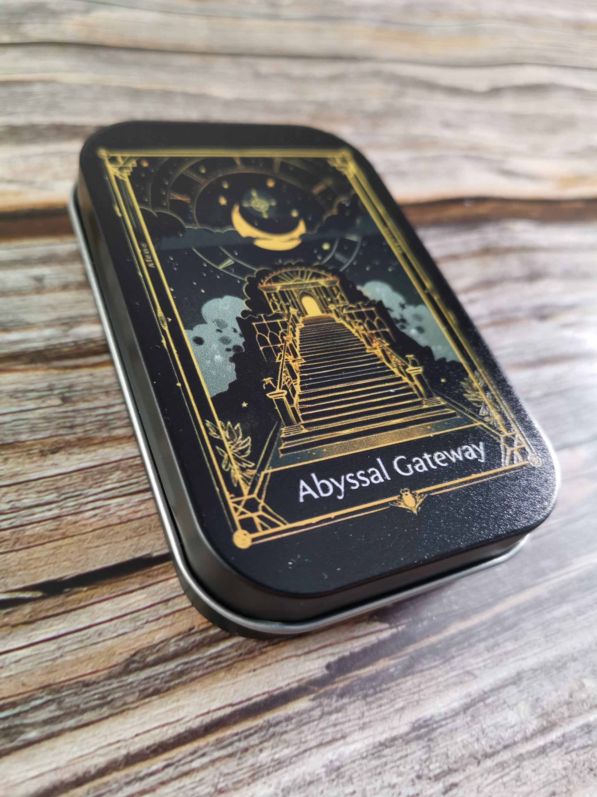 Musta metallinen säilytysrasia okkultistisella kuviolla. Liian pieni Tarot korttien säilytykseen, mutta soveltuu esim. korujen, noppien tai minkä tahansa muun pienen tavaran säilytysrasiaksi.