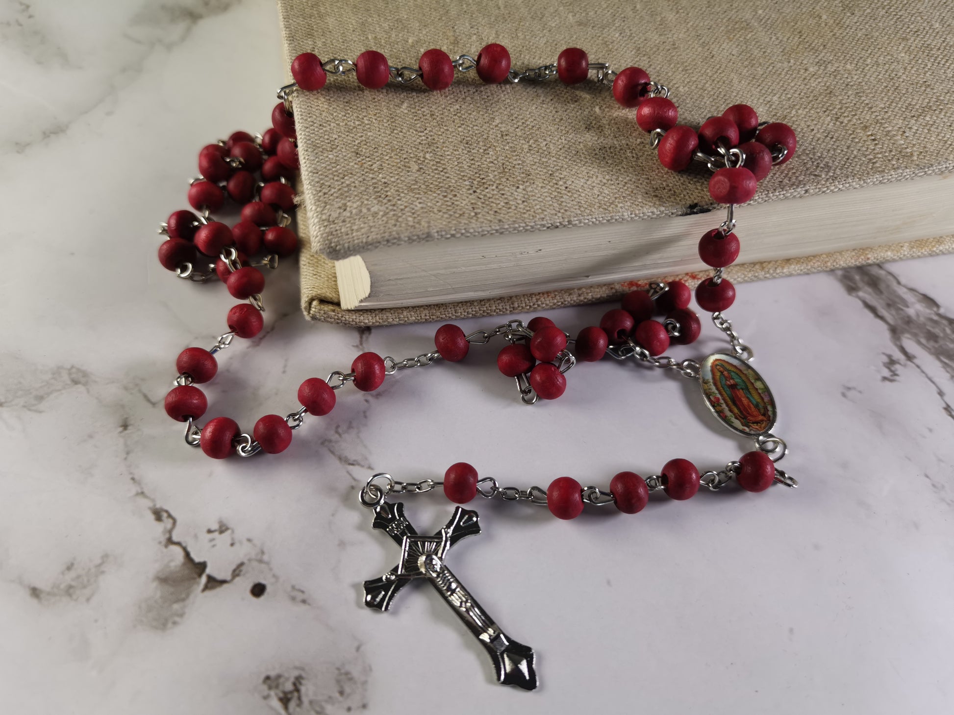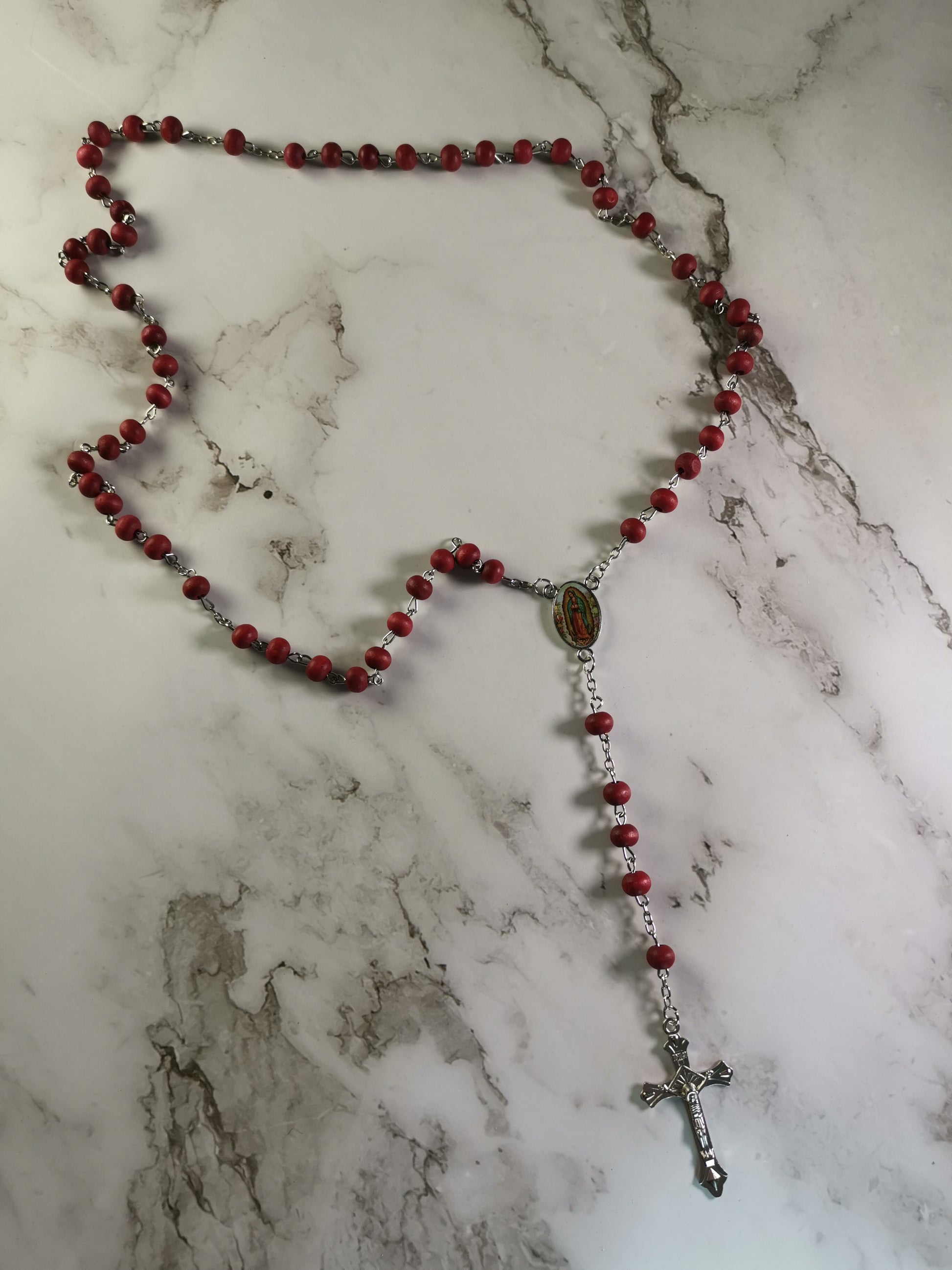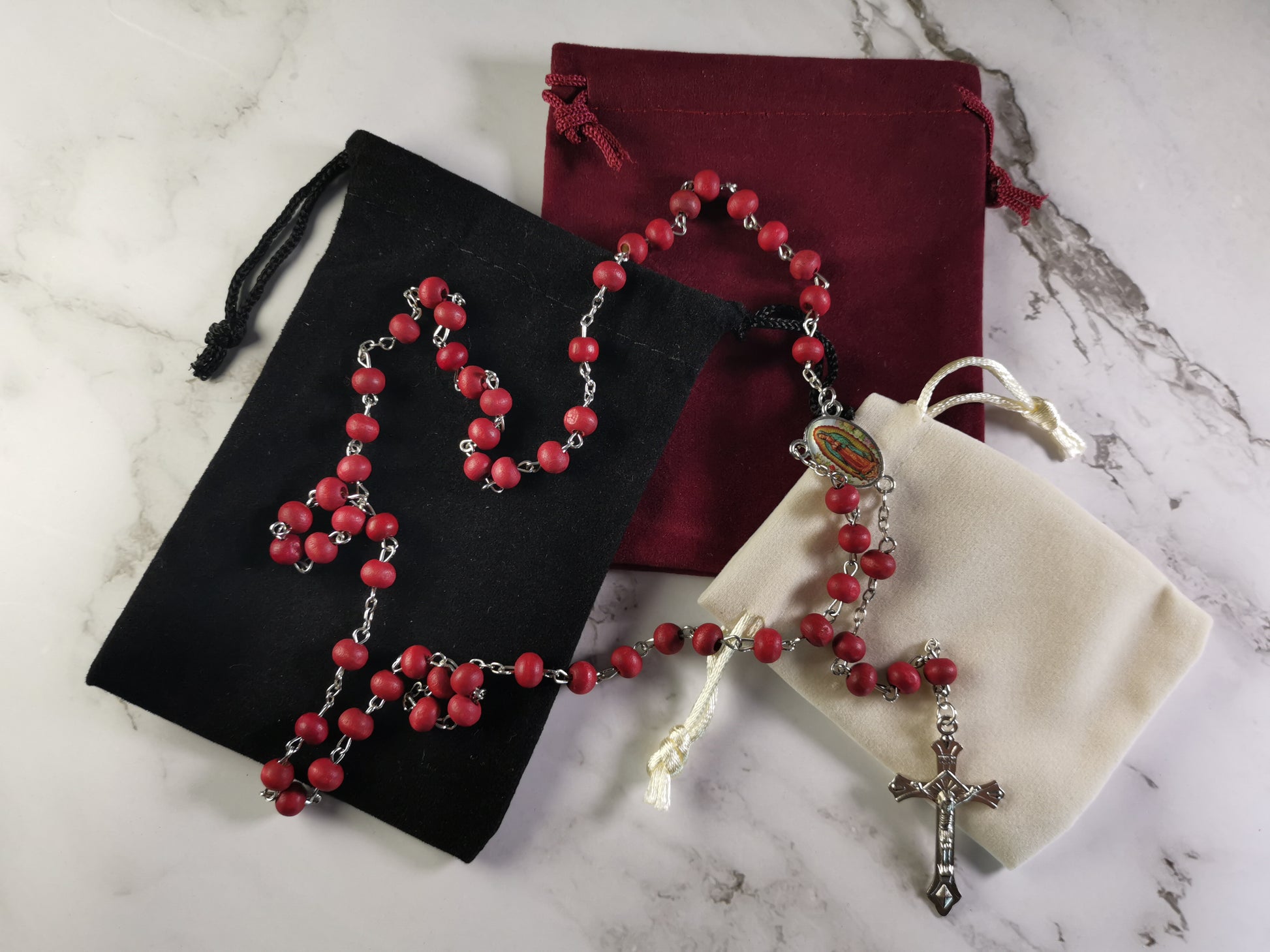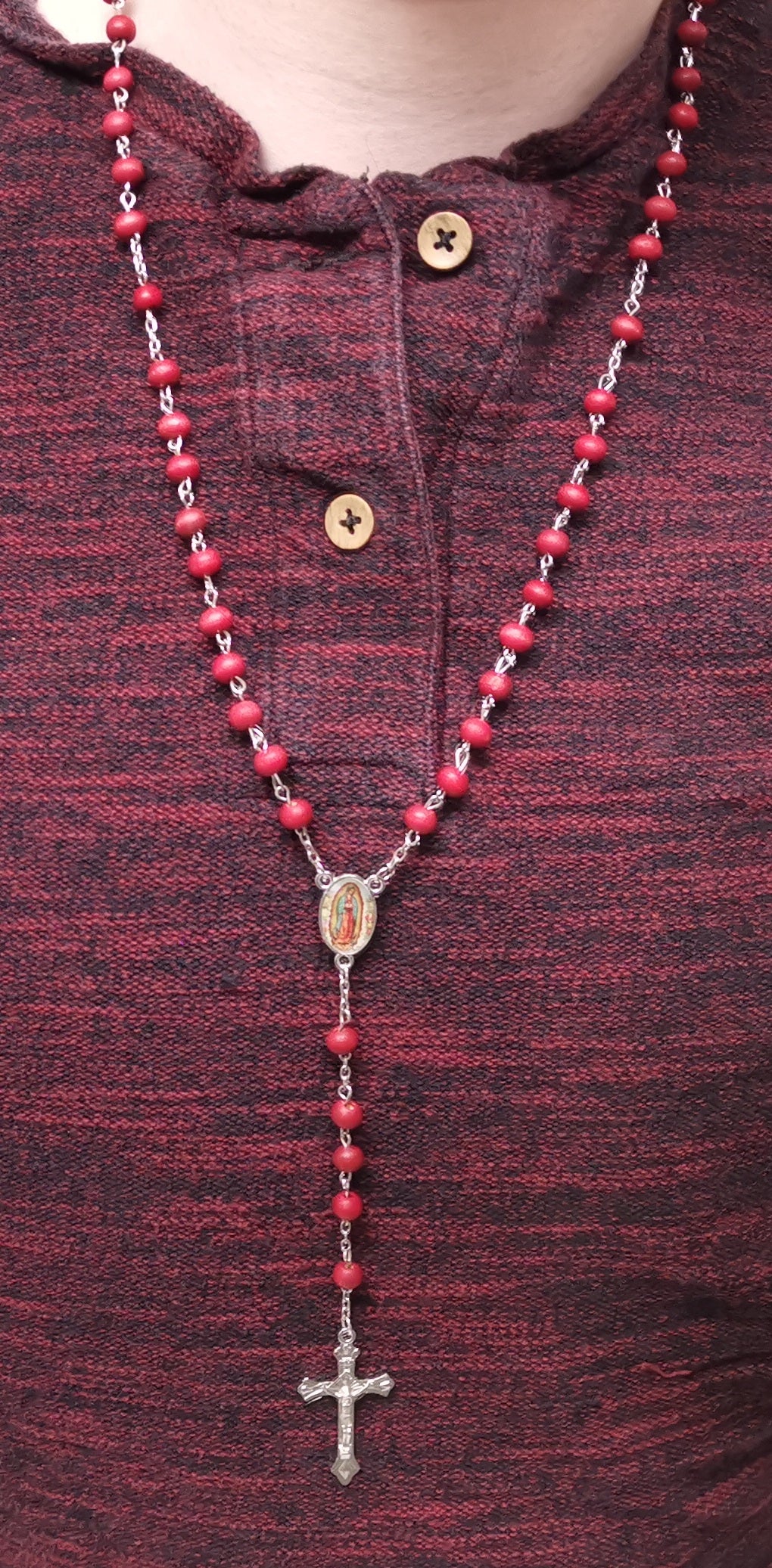 Puisilla tuoksuvilla helmillä, metallisella ketjulla ja krusifiksillä varustettu punainen ruusukko. Helmien tuoksu ei ole vahva, sitä hyvä kun havaitsee kun kaulakorua pitää kaulalla. Rukoushelmien mukana samettinen korujen säilytyspussi.