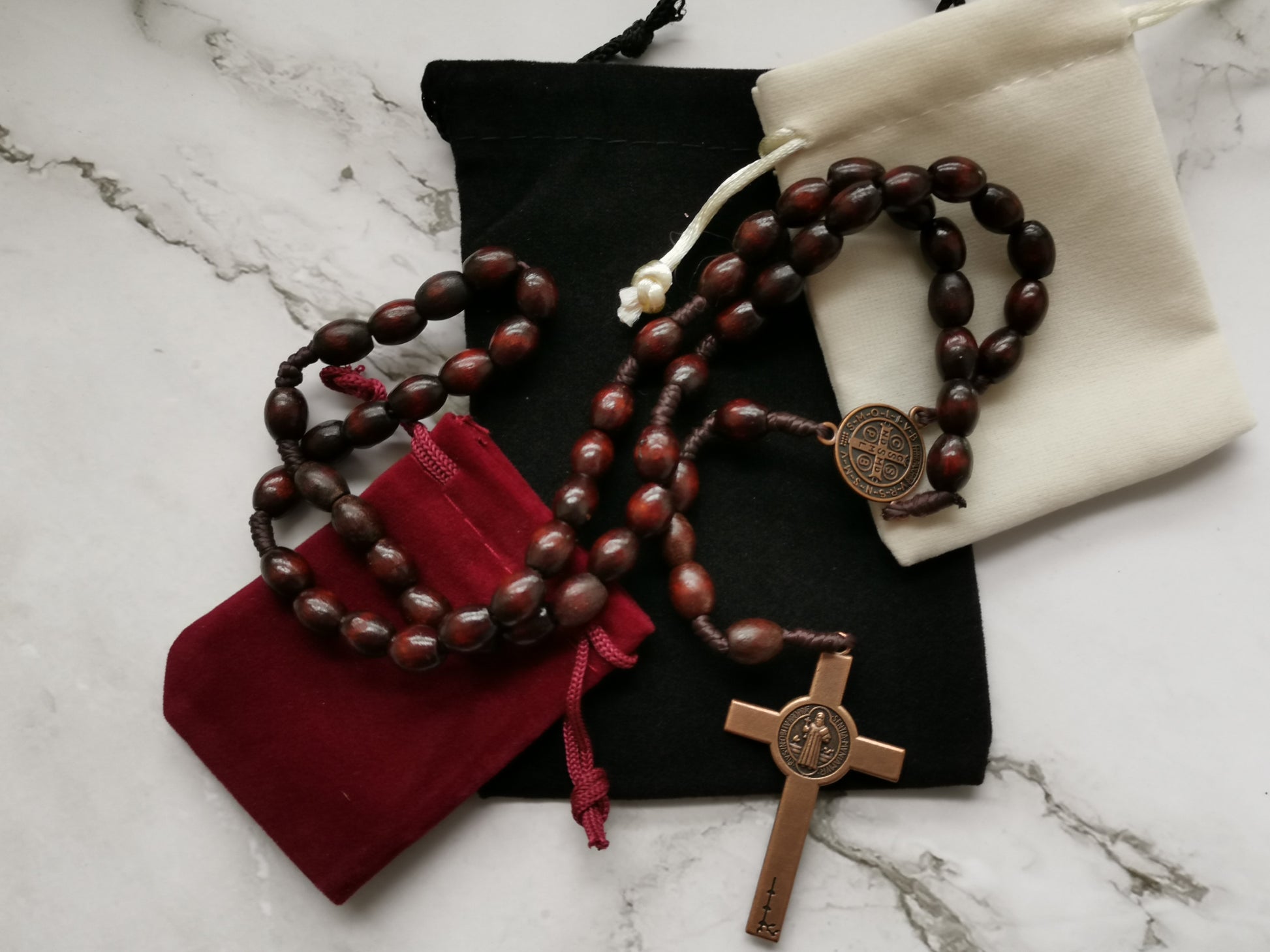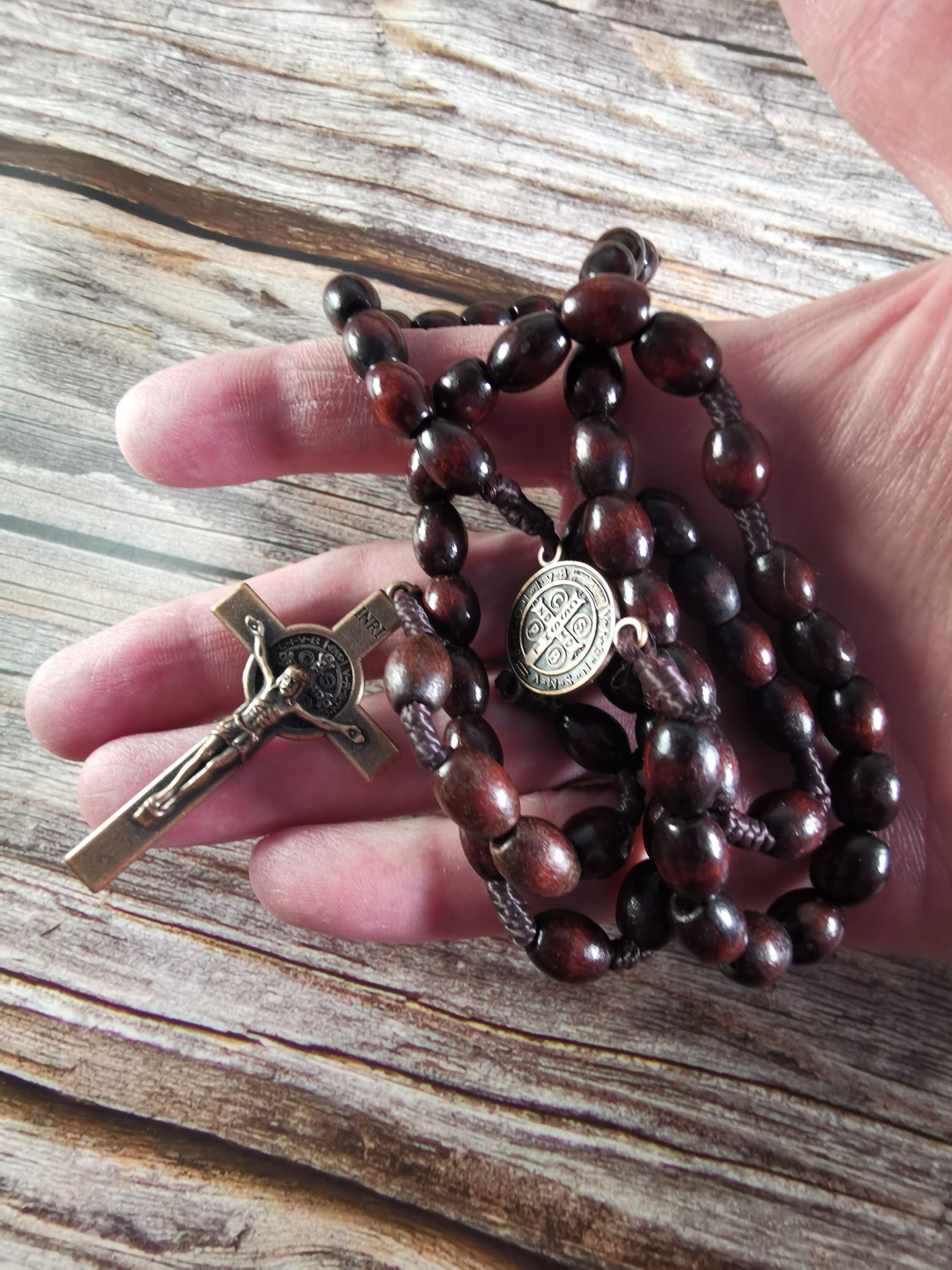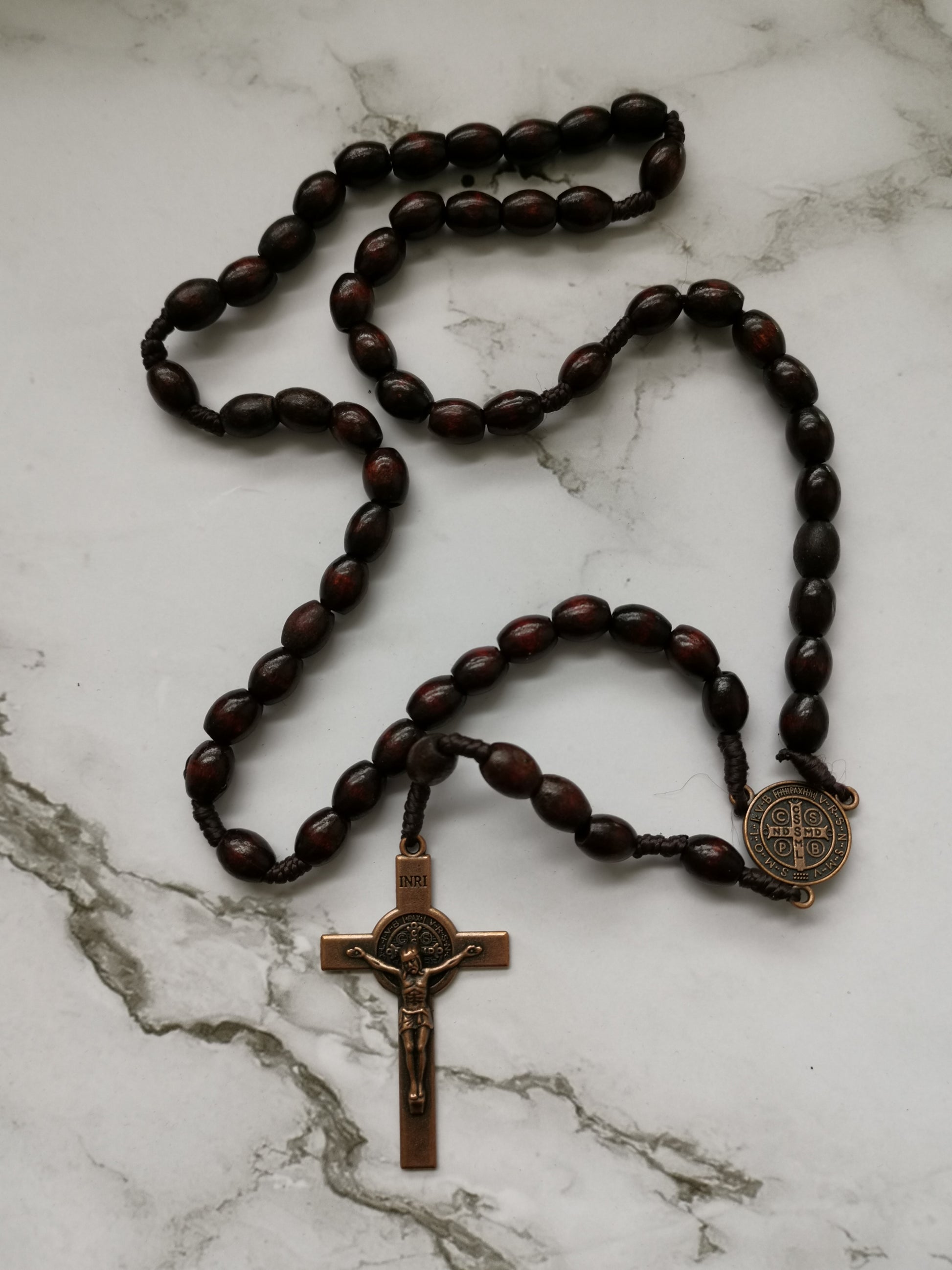 Erittäin tyylikäs puinen ja kokonaan punaisen ruskea ruusukko, jossa metallinen krusifiksi. Kristillinen rukousnauha, jota voi käyttää esim. rukouksien laskemiseen tai kaulakoruna. Rukoushelmien mukana tulee samettinen korujen säilytyspussi.