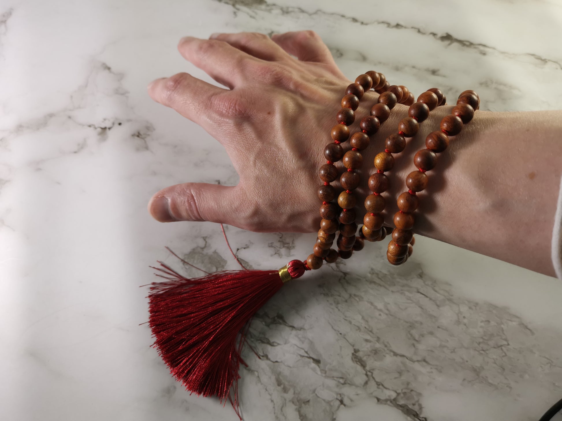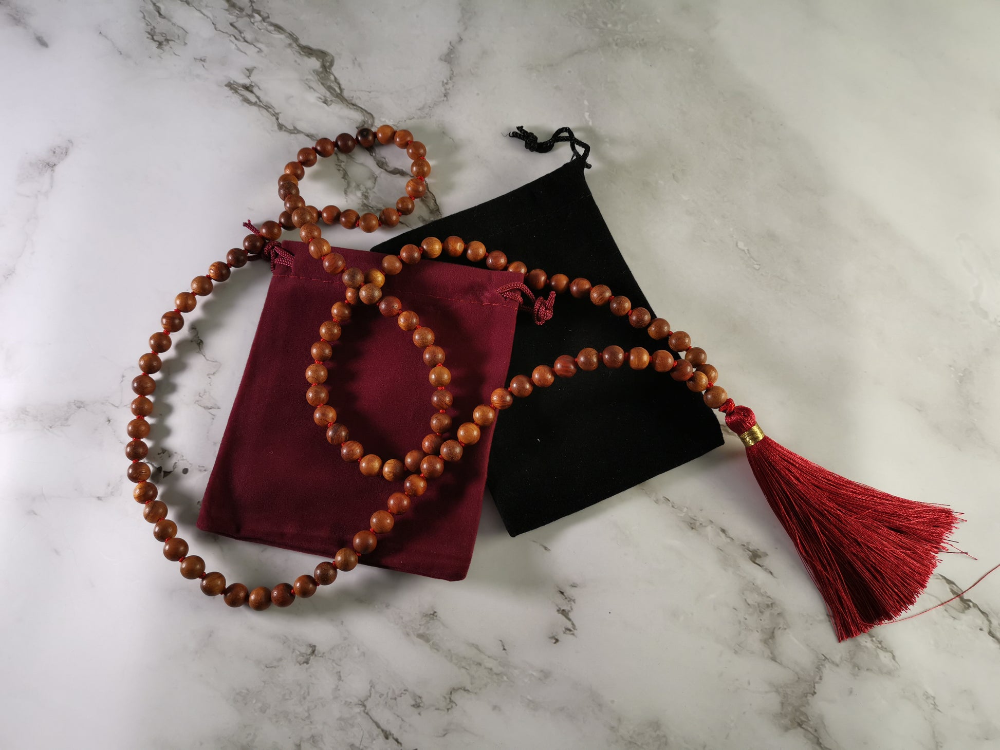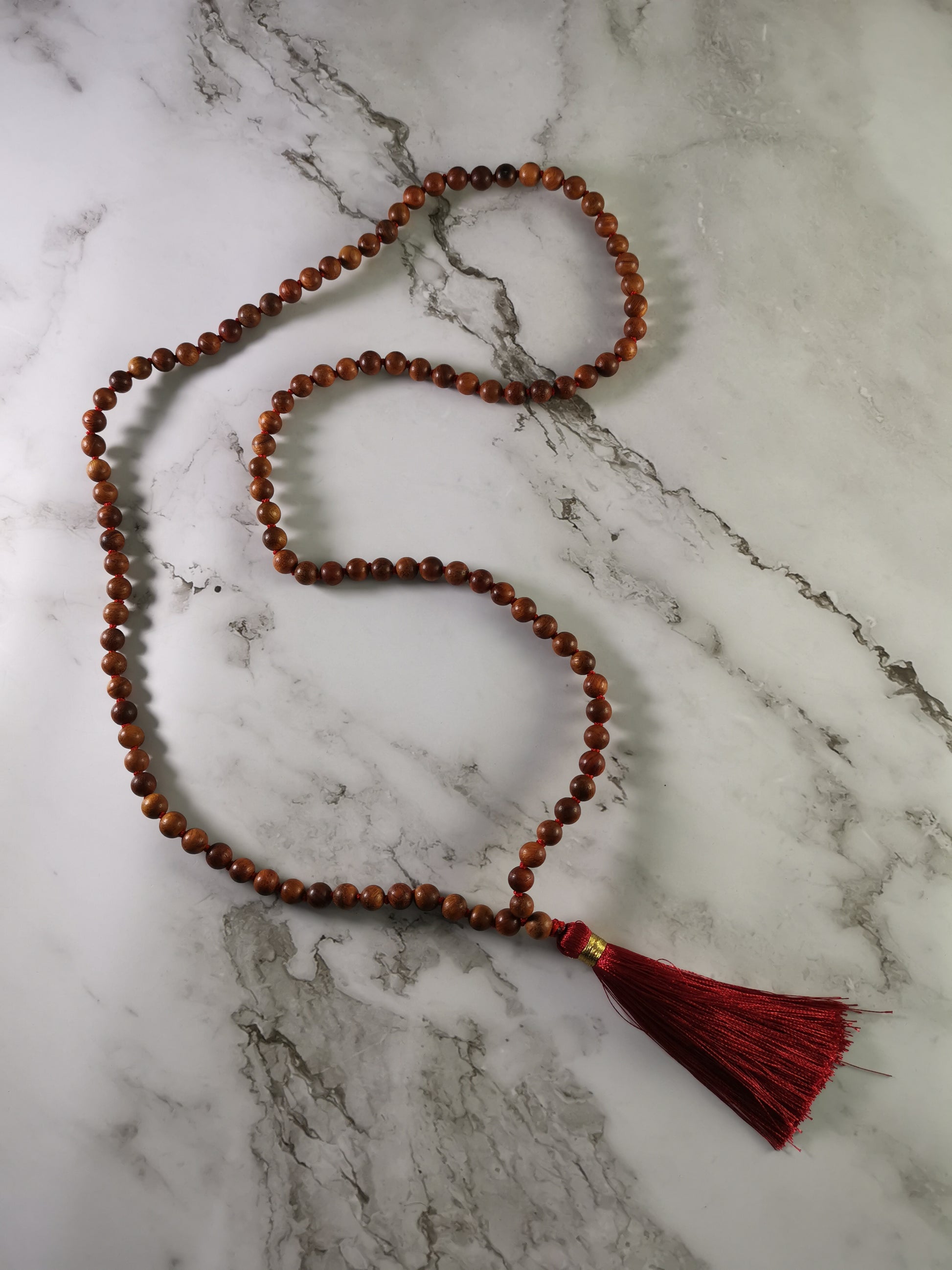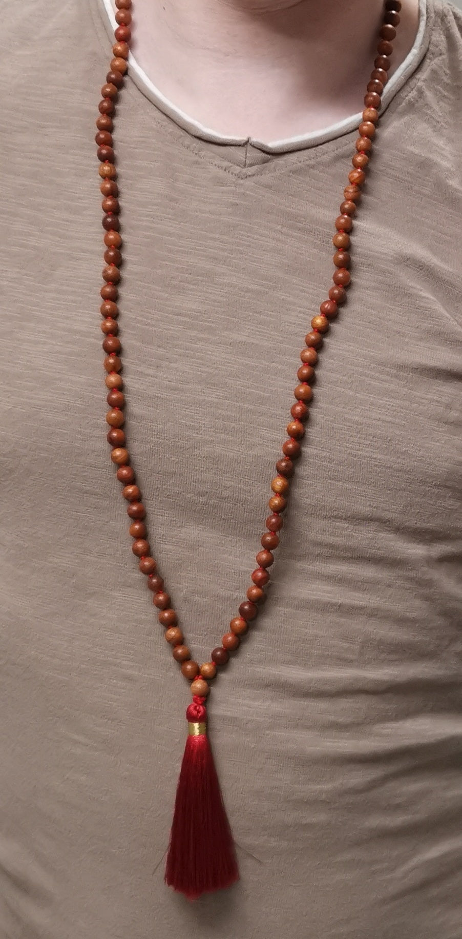 Maanläheinen ja perinteinen itämainen rukousnauha punertavanruskeilla puuhelmillä ja punaisella guru bead tupsulla. 108 helminen mala. Voidaan käyttää meditaation, mantrojen ja rukouksien tukena tai kaulakoruna. Rukoushelmien mukana samettinen korujen säilytyspussi.