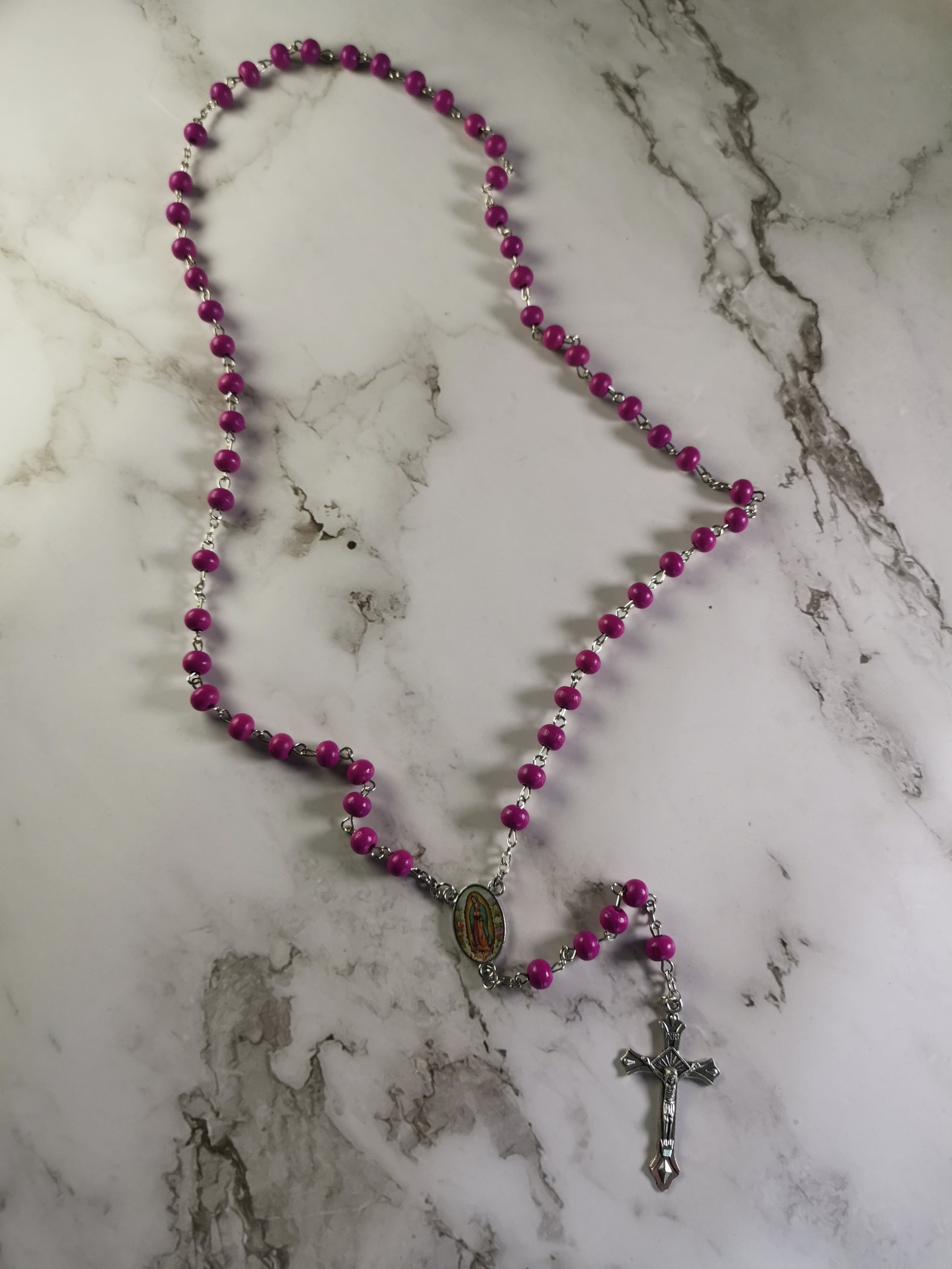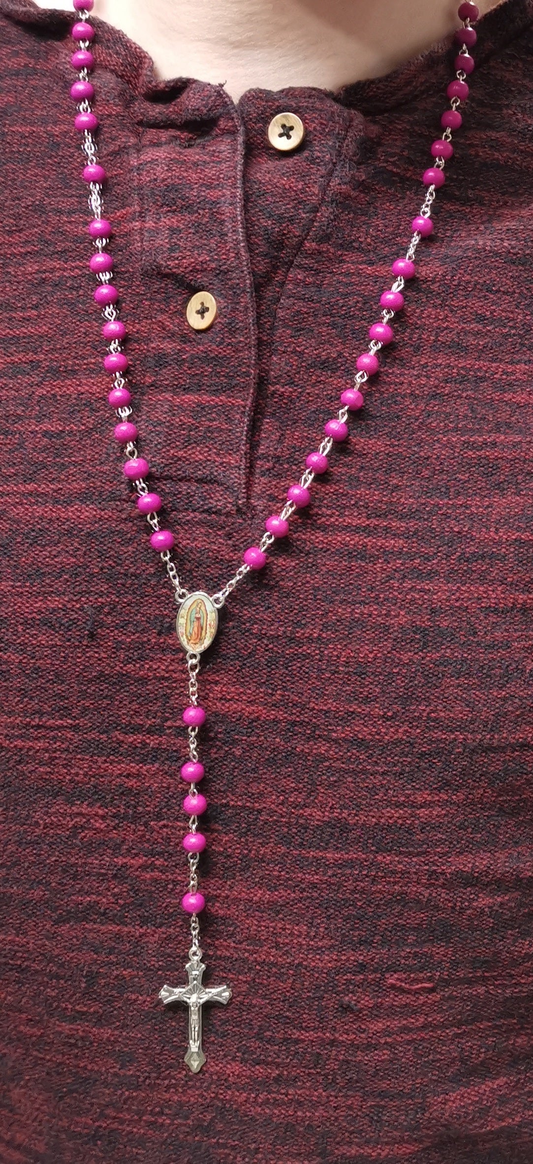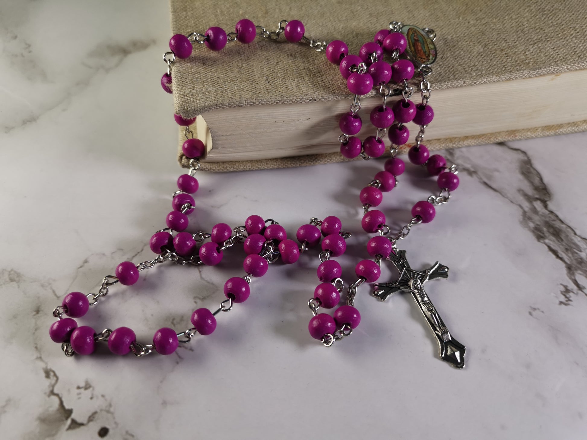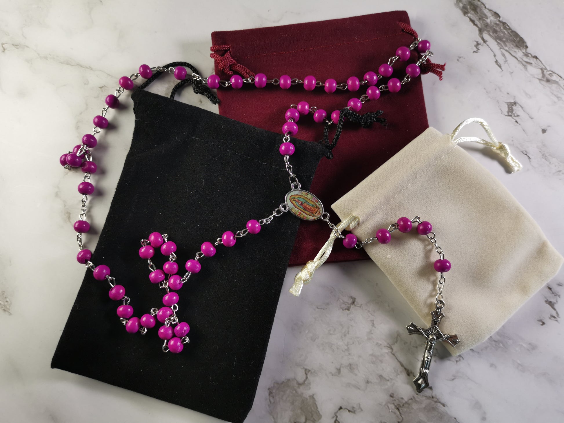 Purppuraisilla helmillä, metallisella ketjulla ja krusifiksillä varustettu ruusukko. Helmien tuoksu ei ole vahva, sitä hyvä kun havaitsee kun kaulakorua pitää kaulalla. Rukoushelmien mukana samettinen korujen säilytyspussi.