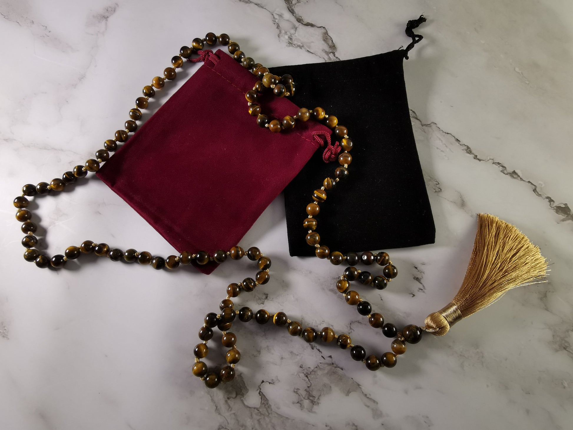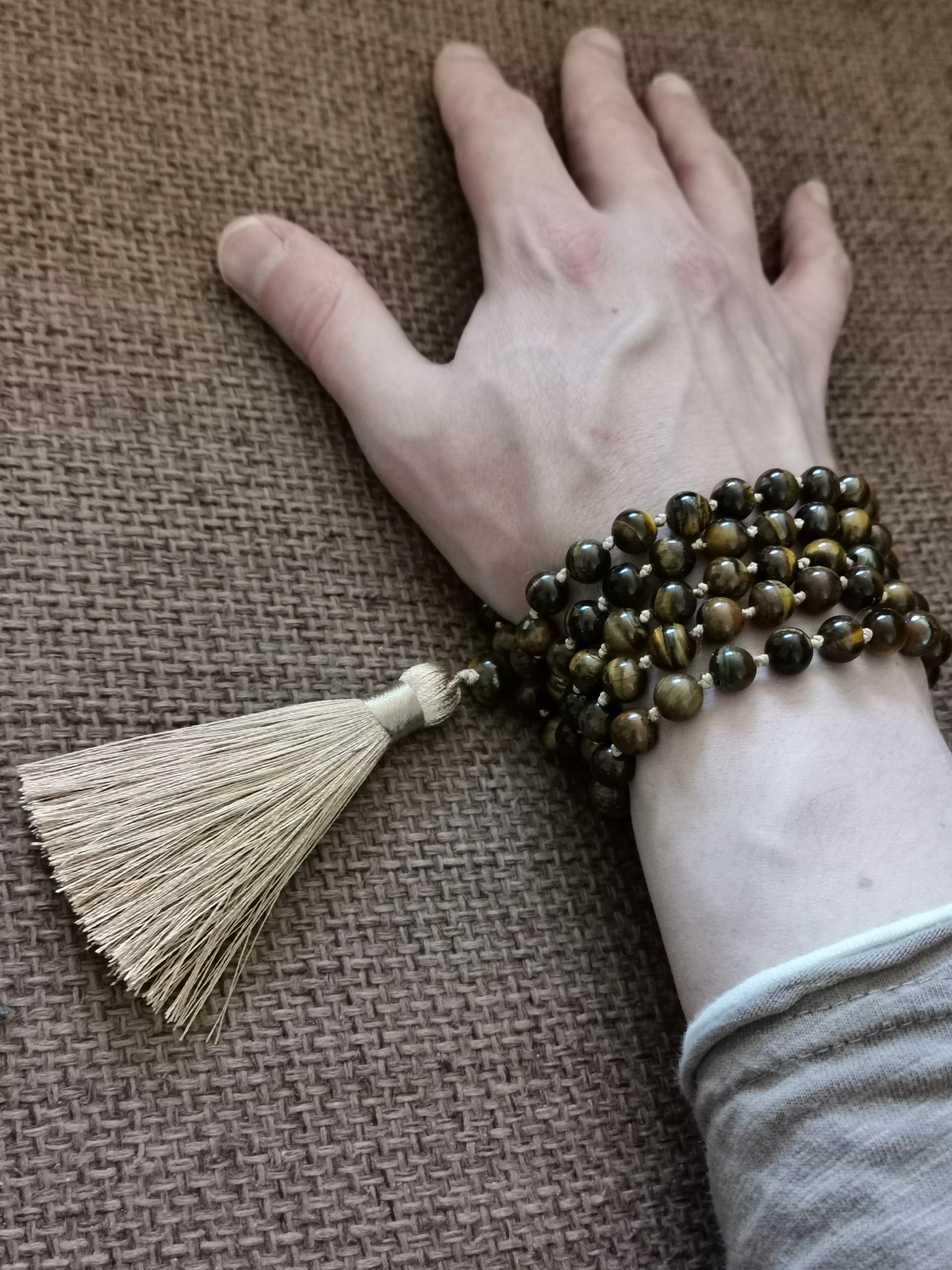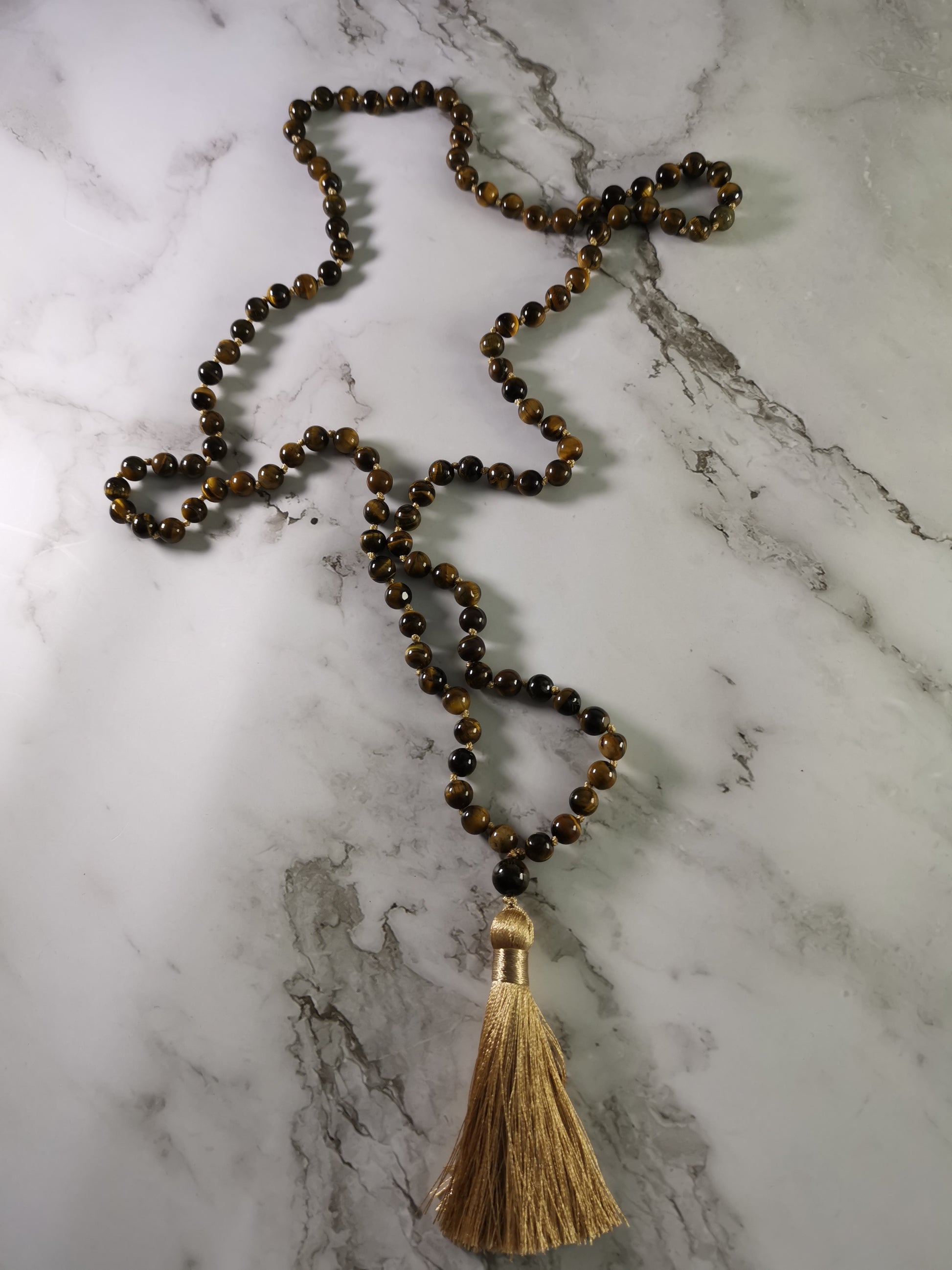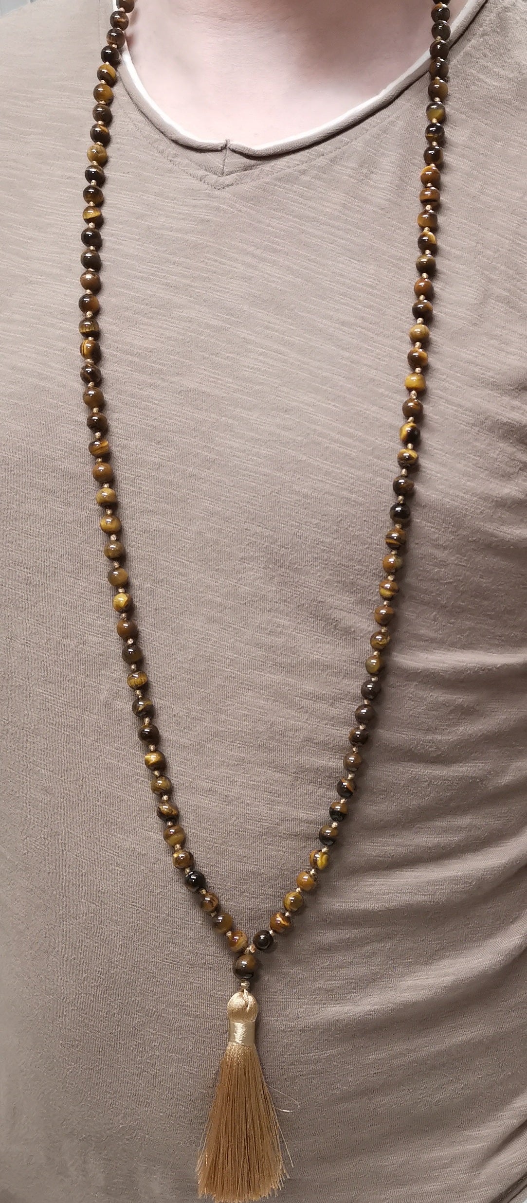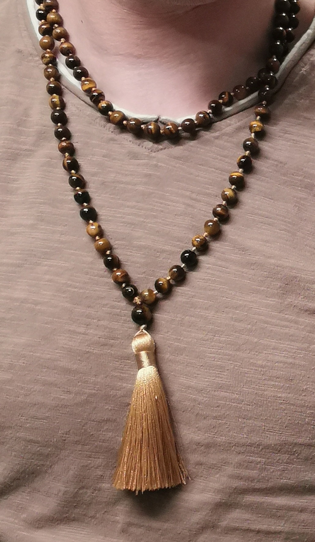 Vaihtelevan ruskeilla kivihelmillä varustettu pitkä itämainen rukousnauha. 108 helmeä mala. Vaaleanruskea guru bead tupsu. Kiviset helmet tuovat malaan jämeryyttä ja tuntuvat käsissä maadoittavalta. Voidaan käyttää meditaation, mantrojen ja rukouksien tukena tai kaulakoruna. Rukoushelmien mukana samettinen korujen säilytyspussi.