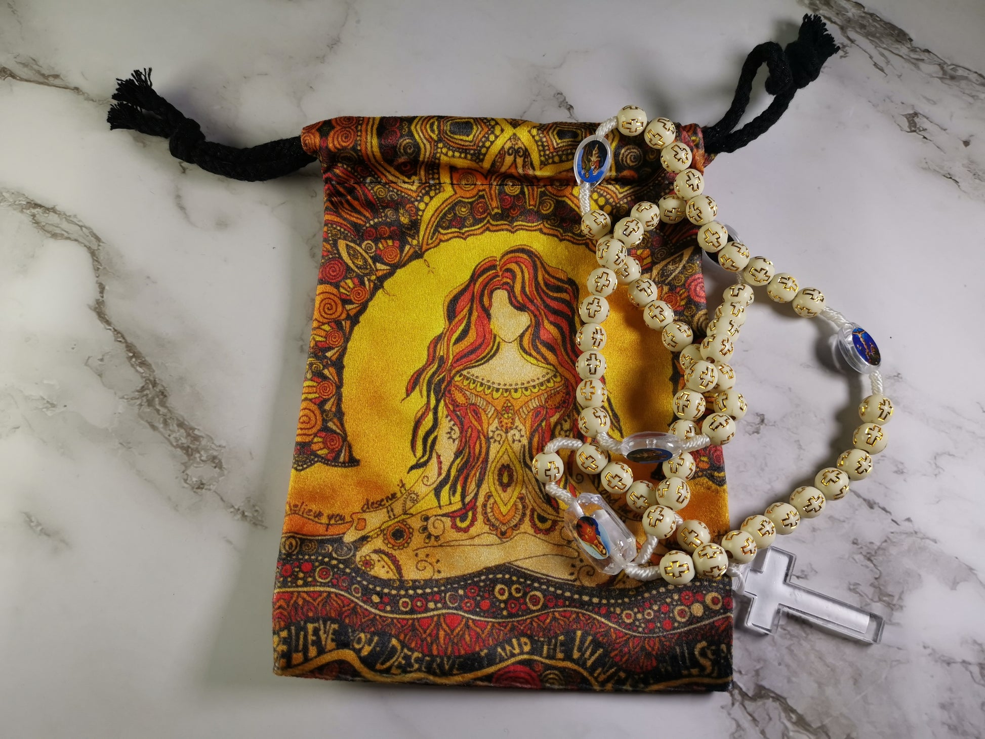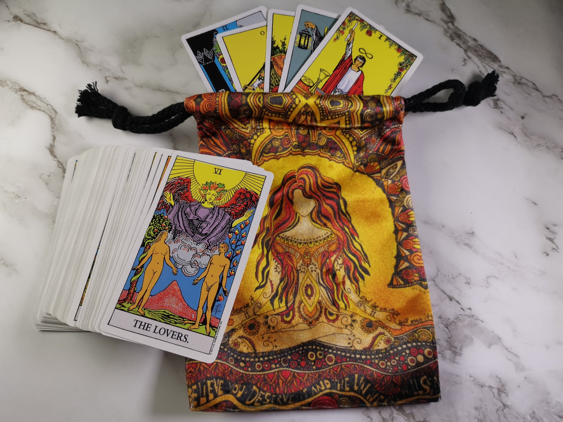 Kesän ja tulen pussukka. Voidaan käyttää esim. Tarot korttien, korujen tai noppien säilytyspussina. Soveltuu myös feminiinisen voiman säilömiseen.
