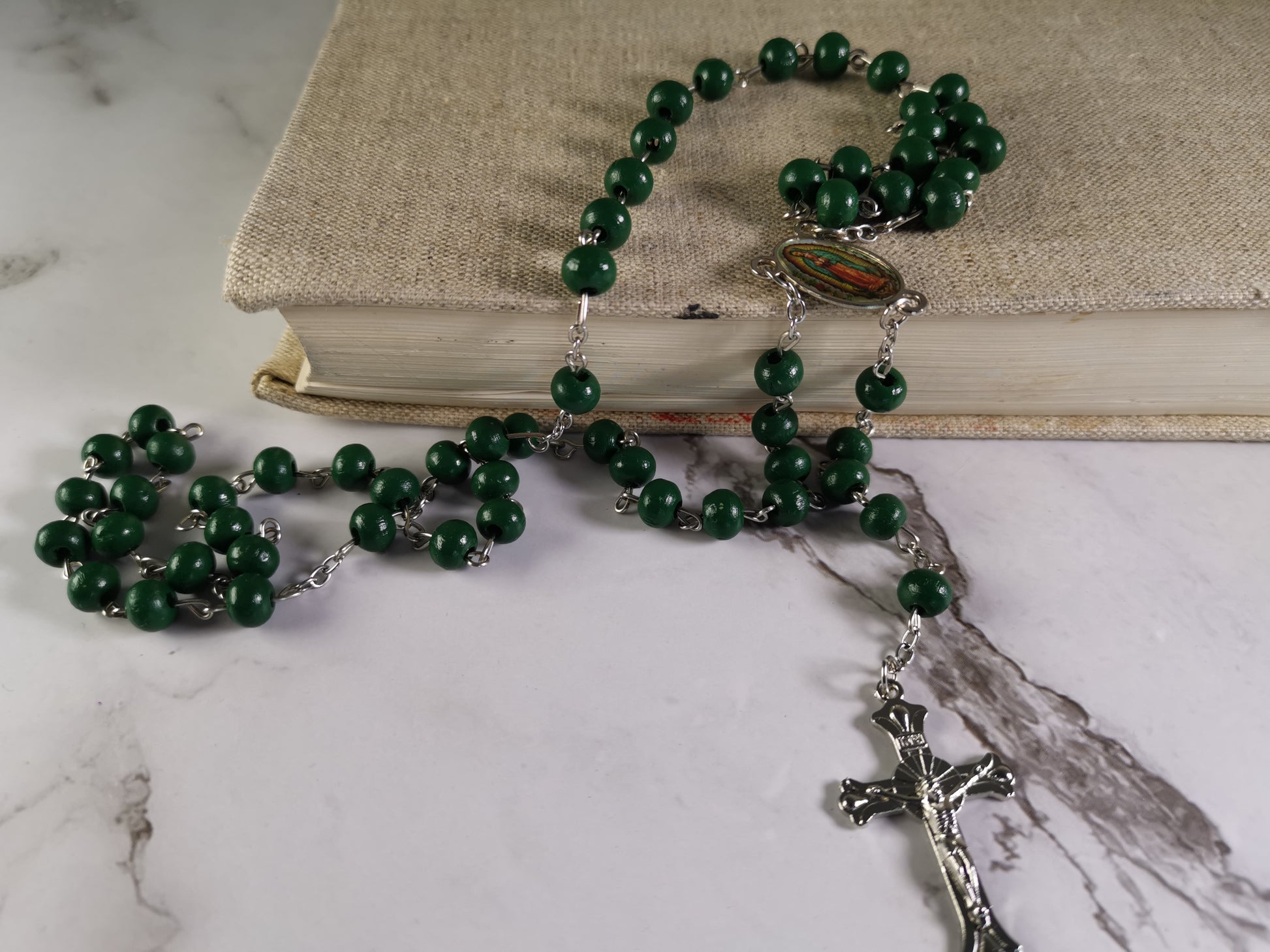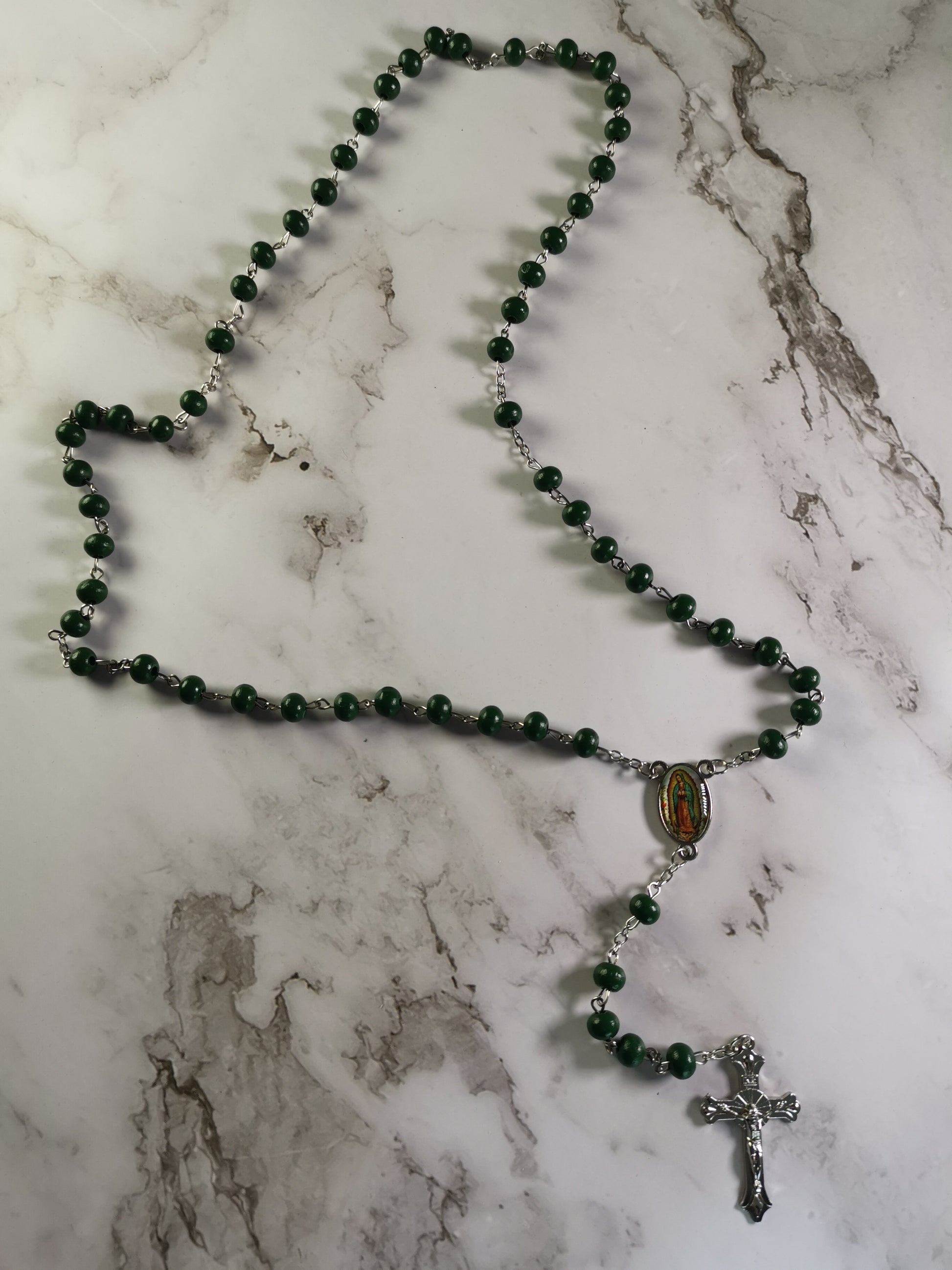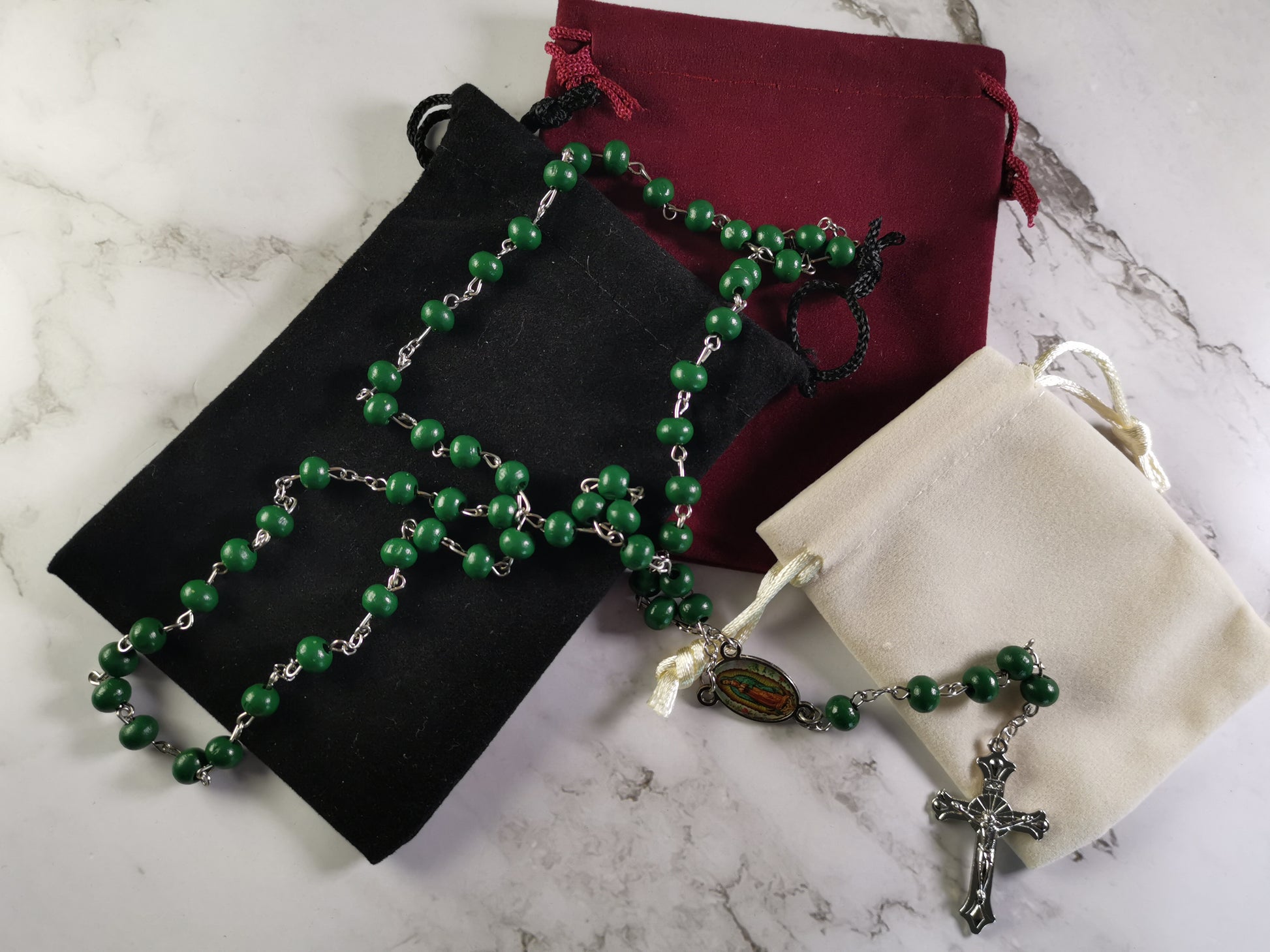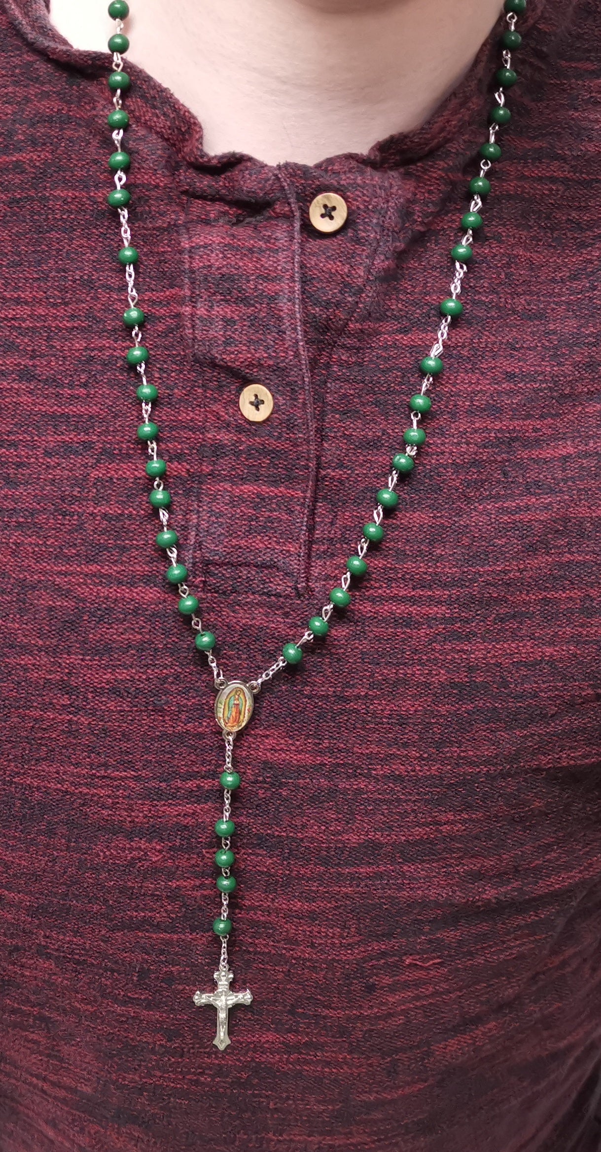 Vihreillä tuoksuvilla helmillä varustettu ruusukko, jossa metallinen ketju ja krusifiksi. Tuoksu ei ole vahva, sitä hyvä kun havaitsee kun pitää kaulakorua kaulassa. Rukoushelmien mukana samettinen korujen säilytyspussi.